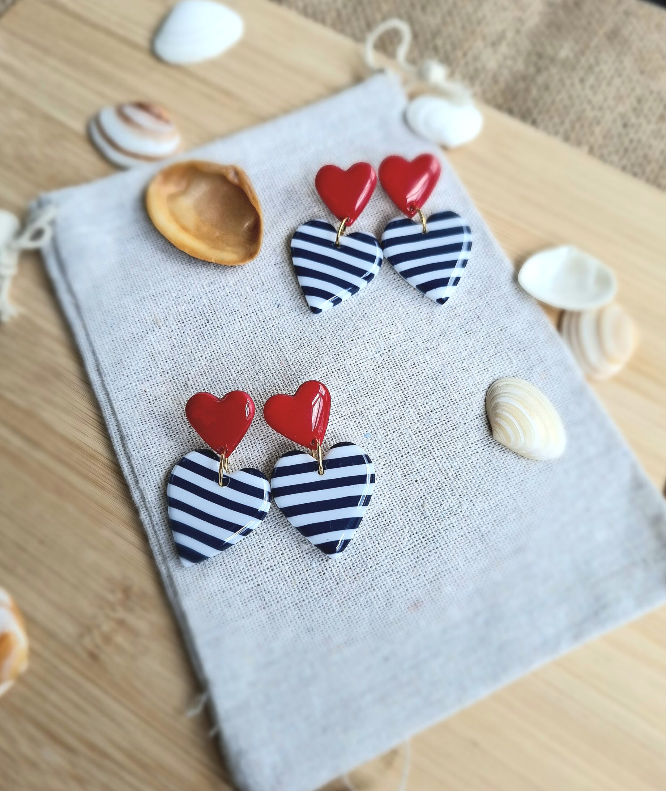 Boucles d’oreilles cœurs rayés colorés – Bijou fait main en argile polymère – Cadeau original femme – Style pop et fun