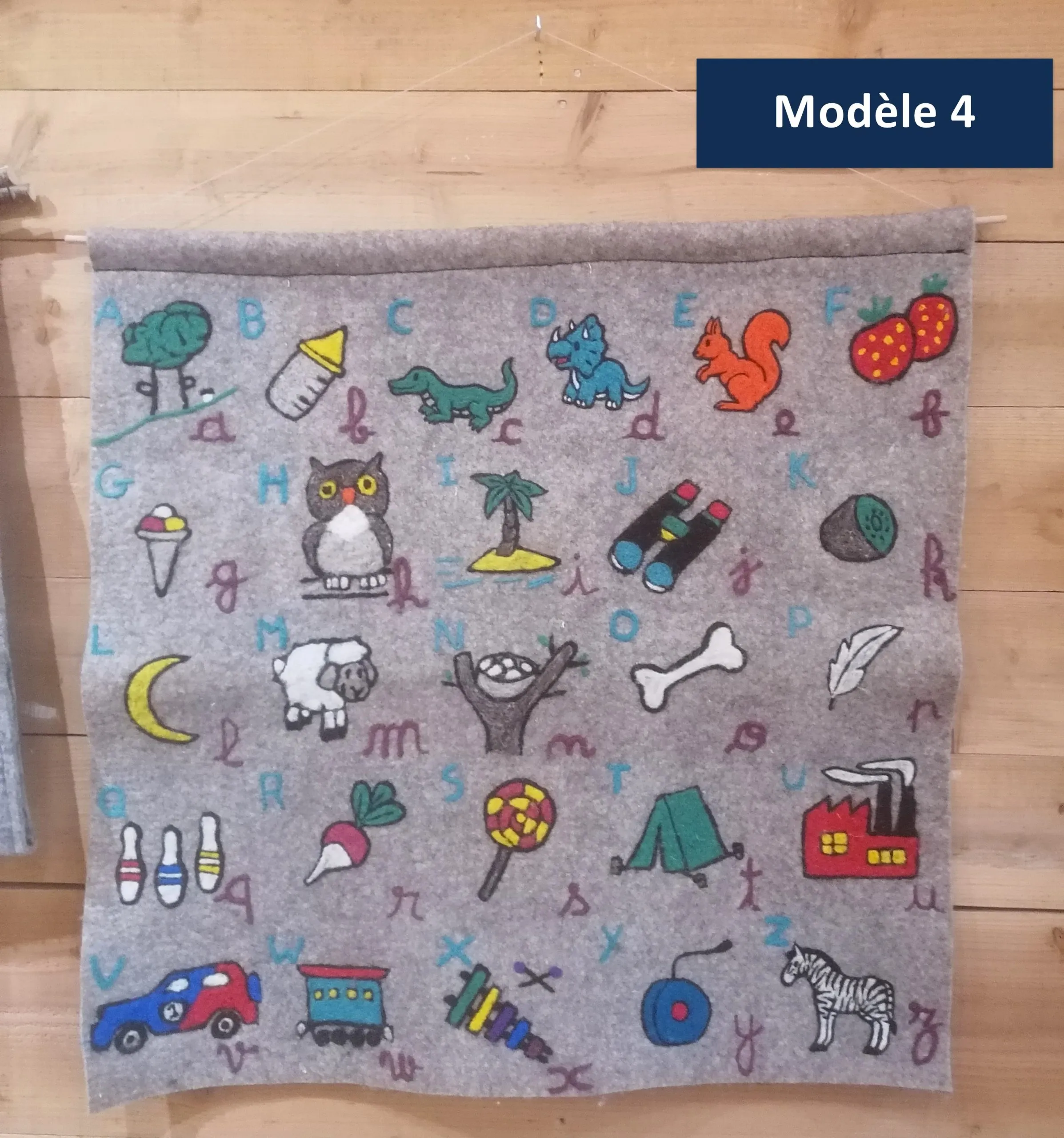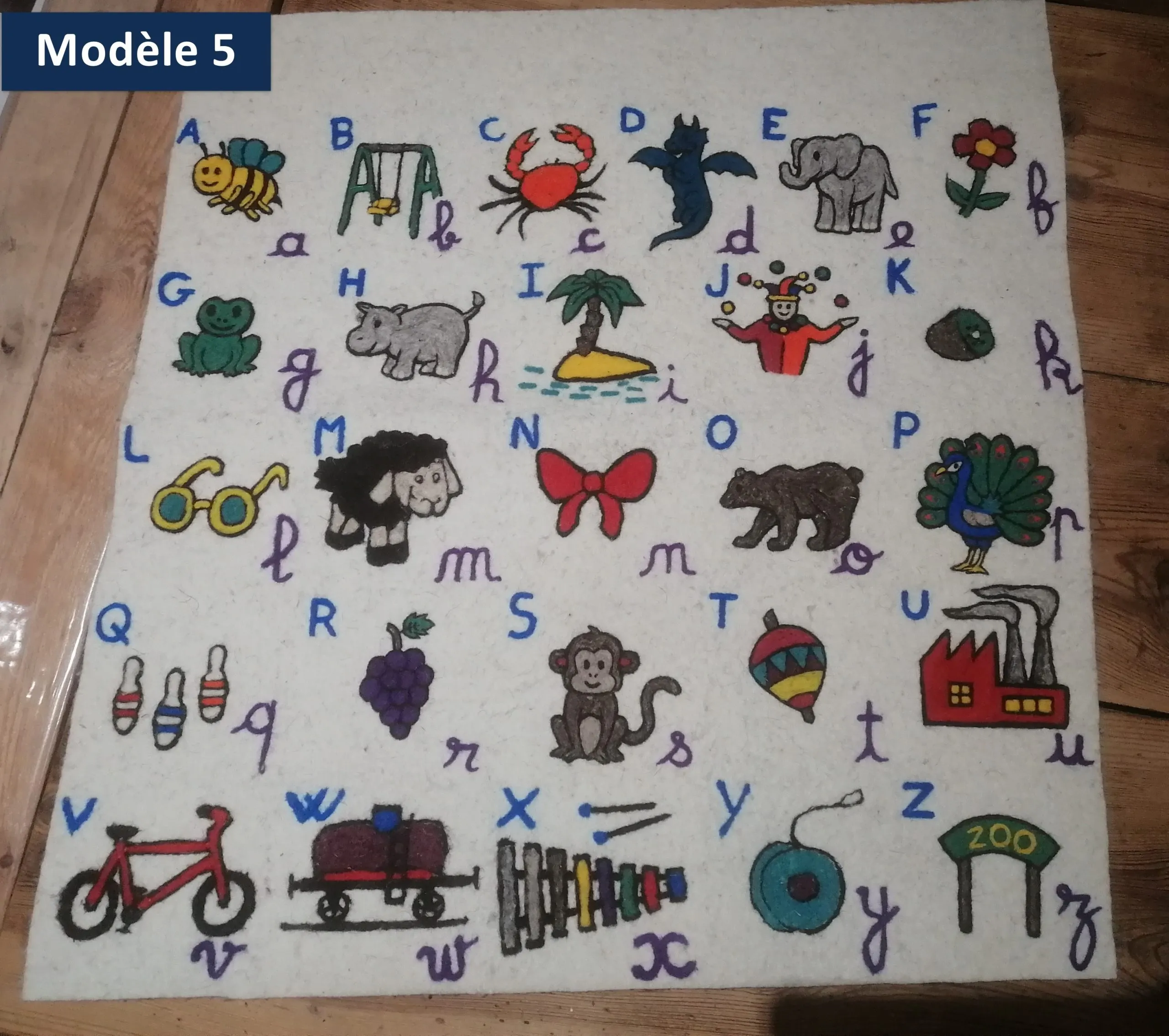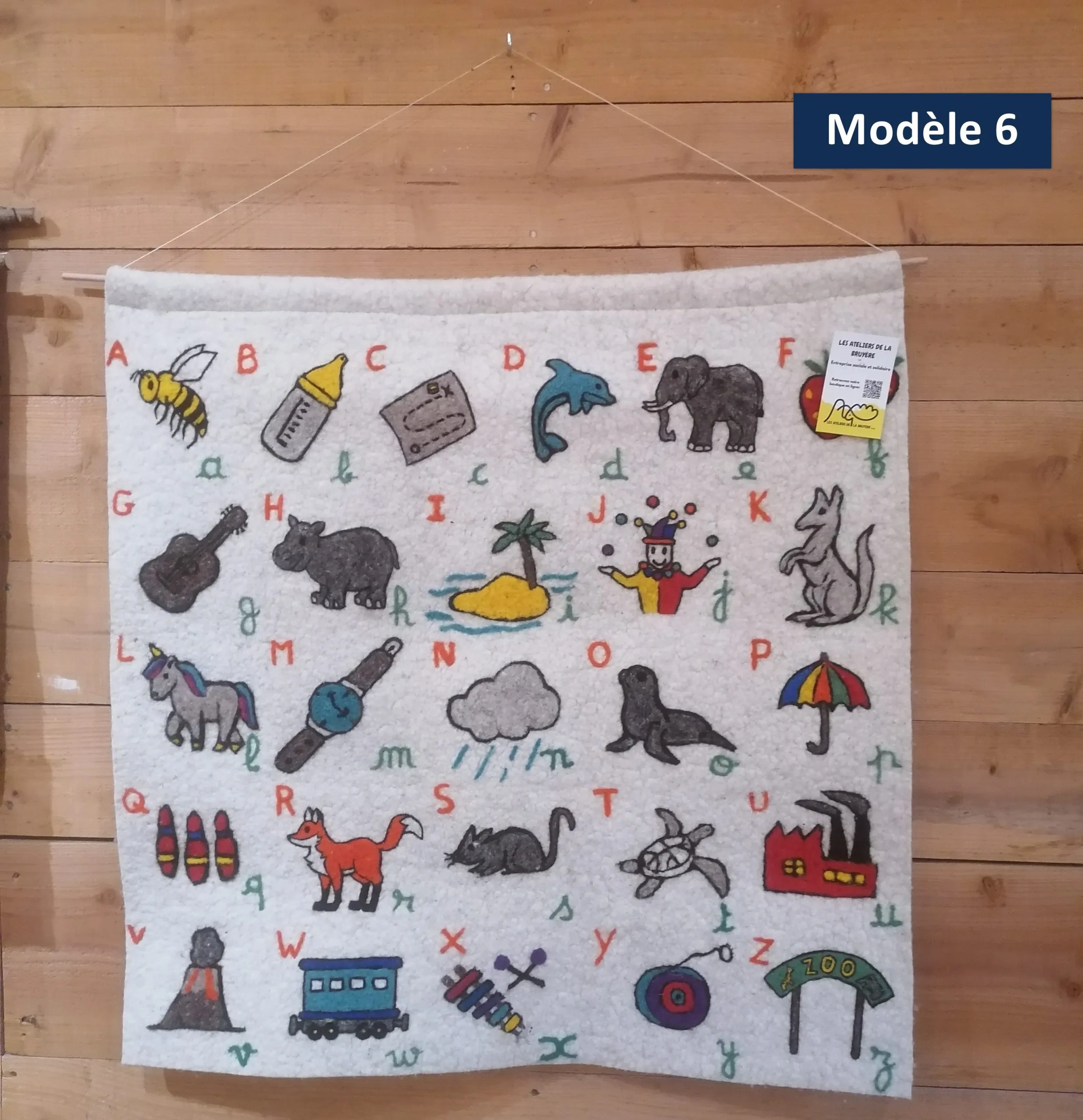 Abécédaire en laine feutrée locale (races Blanche du Massif Central, Bizet ou Noire du Velay dans le Gévaudan) et réalisés au sein d’une entreprise social et solidaire. Les motifs sont réalisés en piquage à l’aiguille manuel.