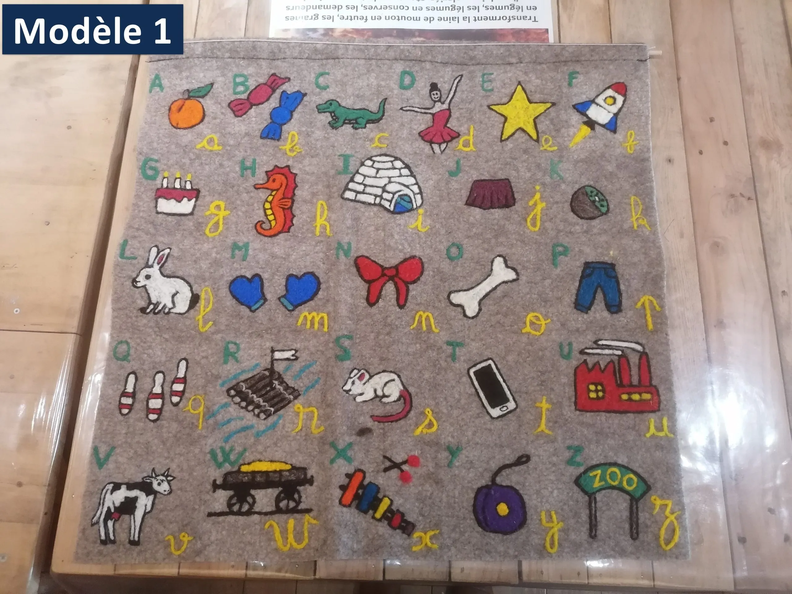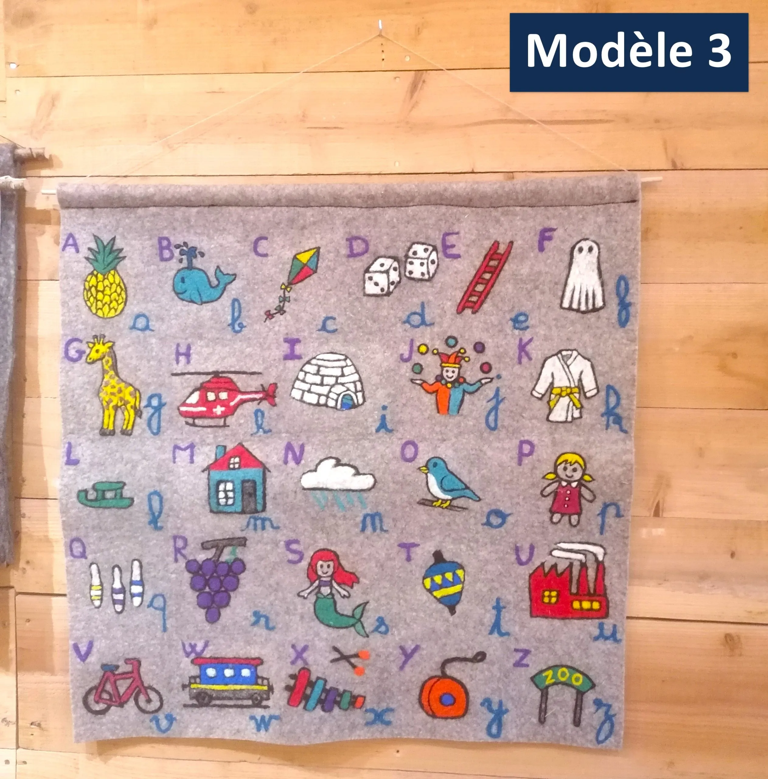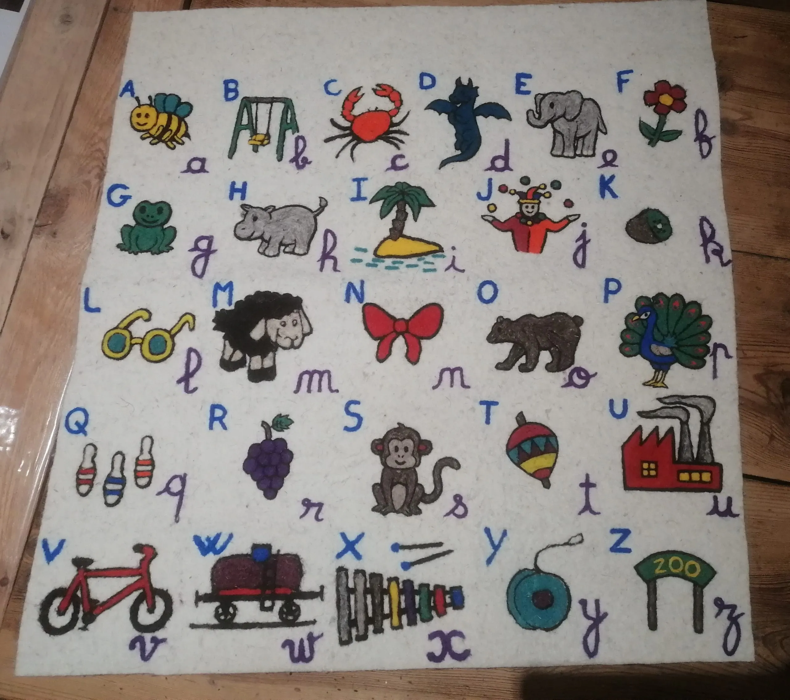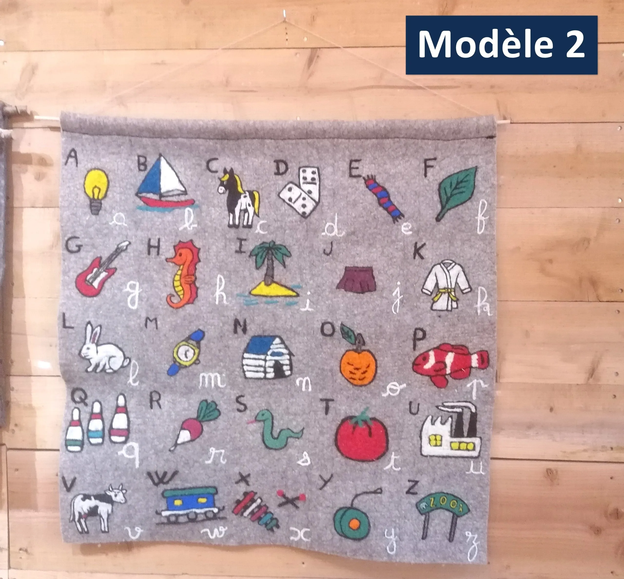 Abécédaire en laine feutrée locale (races Blanche du Massif Central, Bizet ou Noire du Velay dans le Gévaudan) et réalisés au sein d’une entreprise social et solidaire. Les motifs sont réalisés en piquage à l’aiguille manuel.