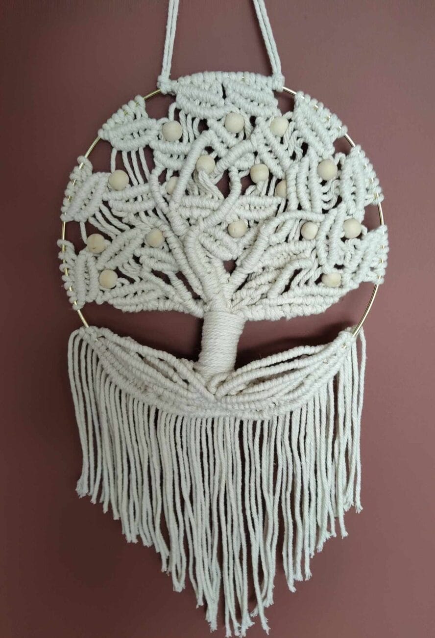 Arbre de Vie en Macramé – Décoration Murale Bohème en Corde Coton Apportez une touche naturelle et apaisante à votre intérieur avec cet Arbre de Vie en macramé, entièrement réalisé à la main. Symbole universel de force, d’équilibre et de renouveau, cet arbre tissé en corde de coton ajoutera une ambiance bohème et chaleureuse à votre décoration. 🌿 Caractéristiques :✔️ Pièce unique : chaque création est réalisée à la main, garantissant un modèle exclusif✔️ Matériaux naturels : corde de coton 100 % et perles en bois pour un rendu authentique et chaleureux✔️ Design raffiné : un travail minutieux du macramé…