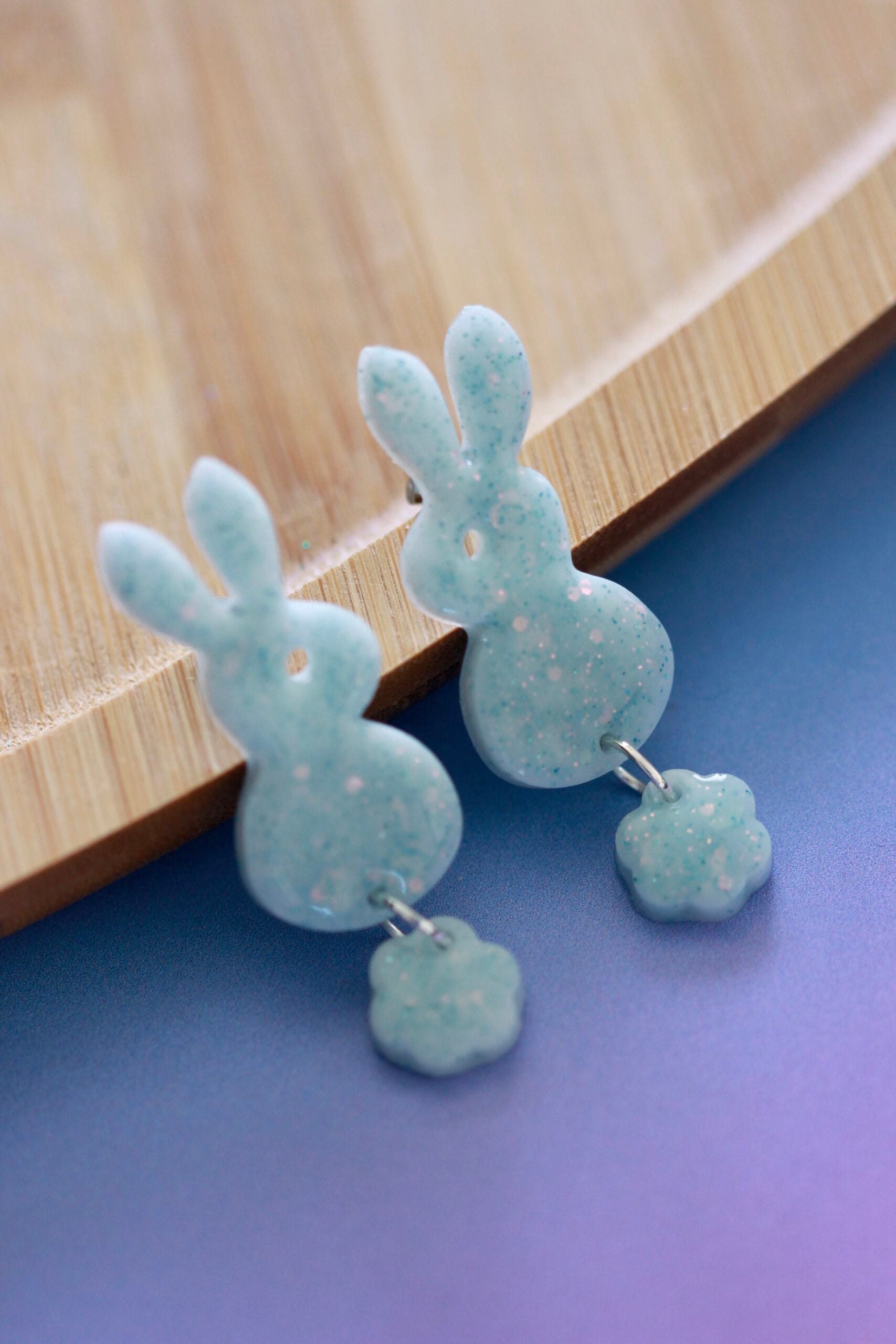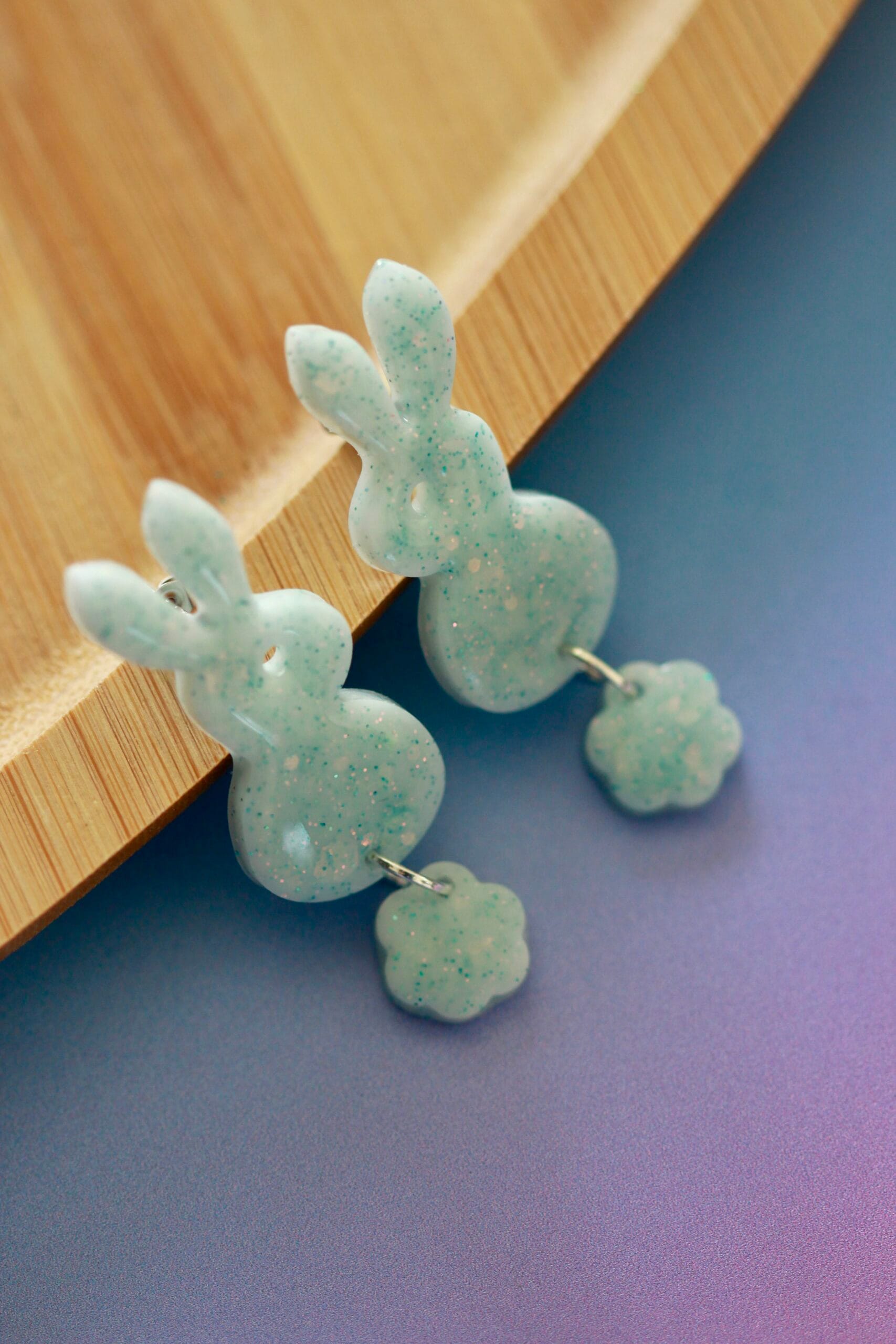 Jolies boucles d’oreilles lapin de Pâques blanches avec des paillettes. Les boucles d’oreilles sont en résine blanche avec une inscrustation de paillettes. Les attaches sont en acier inoxydable. Les boucles d’oreilles lapin de Pâques mesurent environ 5 cm de hauteur.