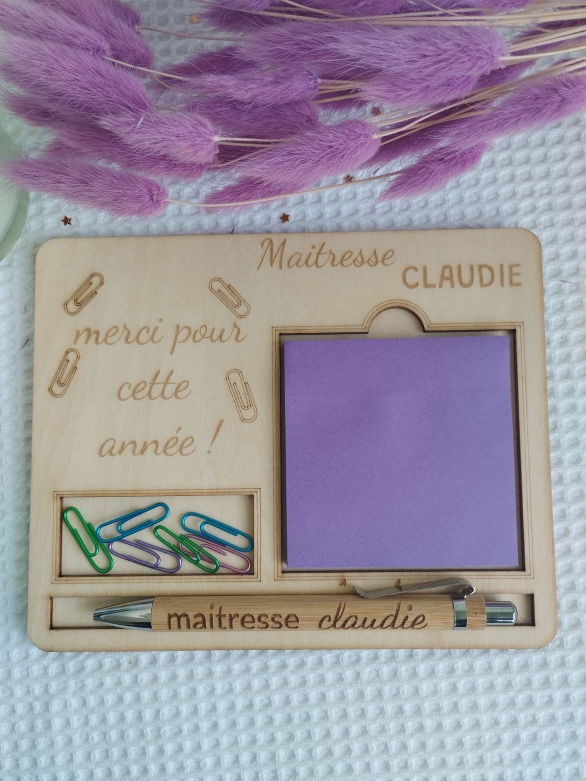 Cadeau personnalisé fin d’année maîtresse – Bloc-notes en bois avec crayon gravé et Post-it
