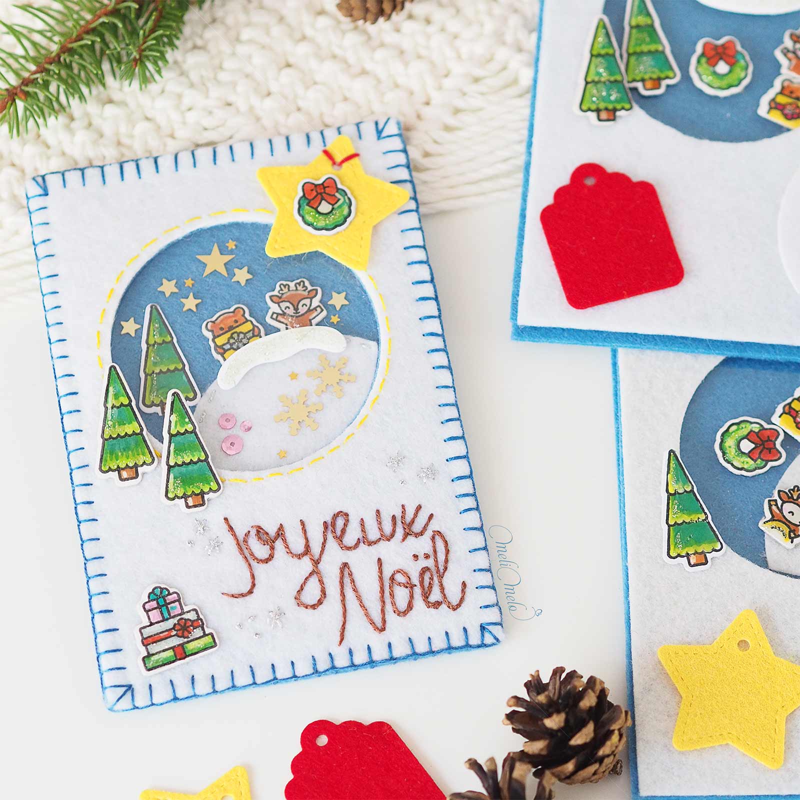 ⊹ 8 décorations {1 renne, 1 ours, 3 sapins, 1 cadeau, 1 couronne} aléatoires Lawn Fawn encrées au tampon Versacraft, découpées à la machine Sizzix manuelle, coloriées au feutre, pailletées et vernies par mes soins